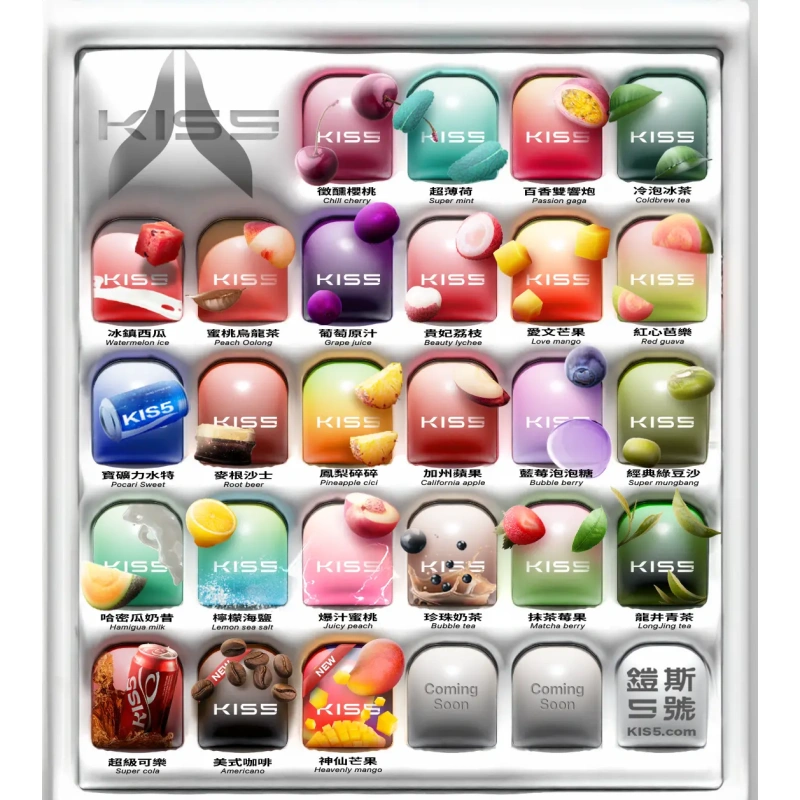 Kiss 5號煙彈擁有多樣化的口味選擇,滿足不同使用者的需求。水果系列口味如草莓、葡萄、檸檬等,清新自然,甜而不膩,宛如置身果園般享受甜美的滋味。除此之外,創新口味如薄荷與奶茶,帶來了耳目一新的味覺體驗和無與倫比的滿足感。無論您是電子煙的新手還是老手,都能在Kiss 5號煙彈中找到最合適的口味。